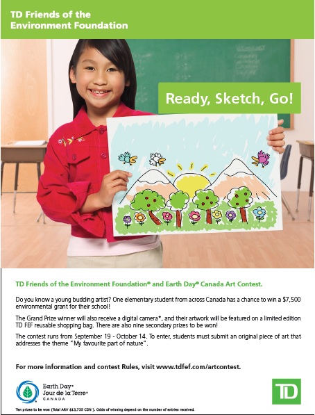 The TD Friends of the Environment Fund is running an children’s Nature Art contest. This gives our school a wonderful opportunity to win $7,500 for our yard, as well as great prizes for the winning artist and their class. The winning art will be featured on Enviro-Bags distributed by TD!