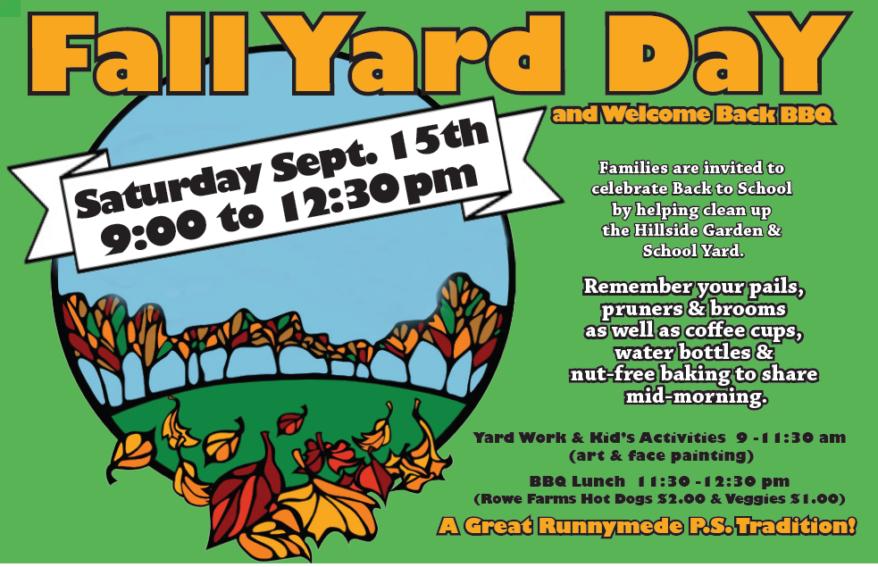 Hope to see you all on Saturday for Fall Yard Day, where families pitch in to help maintain our beautiful school grounds while enjoying some fun kids’ activities and a welcome back BBQ. We hope to see you there.